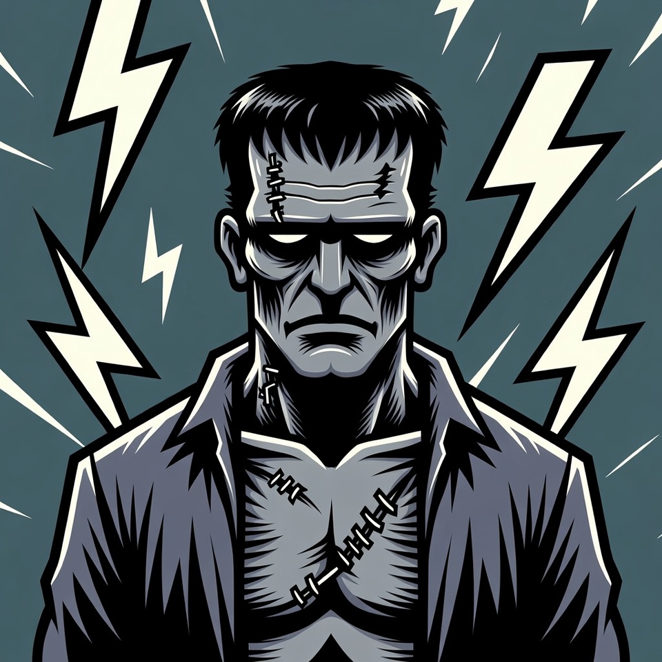 A black and white illustration of Frankenstein's monster with green-tinted skin, stitches on his forehead and body, and wild black hair. He wears a dark jacket with an open collar exposing his chest scars and stares intensely with glowing eyes. Bright lightning bolts surround him against a dark blue background.