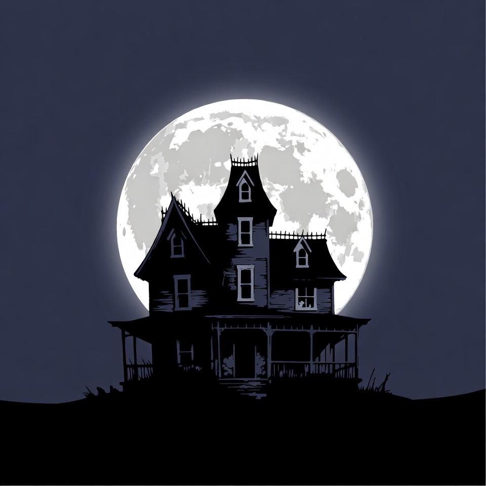 A dark silhouette of a gothic haunted house with pointed roofs and a wraparound porch stands against a night sky. A large full moon glows brightly behind the house, casting subtle light. The scene features sparse grass at the base on an isolated background.