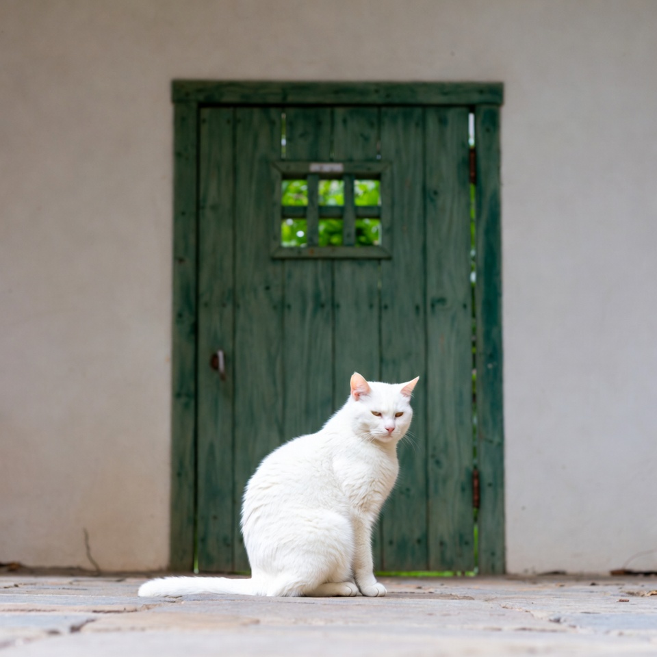 animals, architecture, cat, door window, fluffy cat, green door, outdoor, sitting cat, stone pavement, white wall, wooden door, white cat