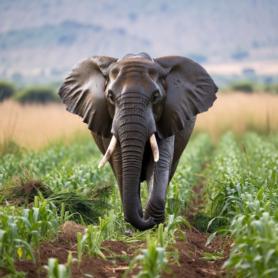 A large African elephant with wide ears and long tusks walks through a lush green field of tall grass and crops. Mountains rise in the distant background under a clear sky. The elephant faces forward with its trunk raised slightly.