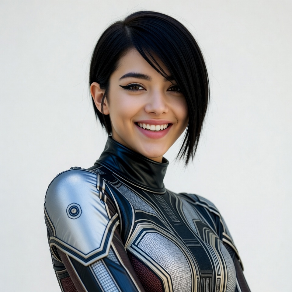 Asian, beautiful woman, black hair, black suit, bob haircut, confident pose, cosplay, cosplay costume, detailed armor, female, futuristic outfit, glossy suit, high collar, metallic suit, portrait, sci-fi suit, short hair, shoulder pads, silver armor, smiling, white background, young woman, woman