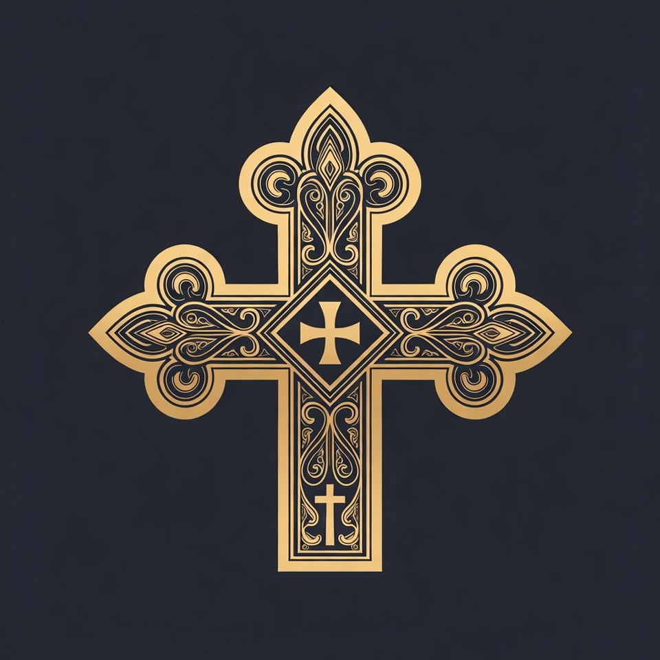 Christian cross, Eastern Orthodox, Gothic cross, clipart, cross symbol, dark background, filigree design, gold outline, golden cross, illustration, intricate patterns, isolated background, navy background, ornate cross, religious icon, religious symbol, Orthodox cross