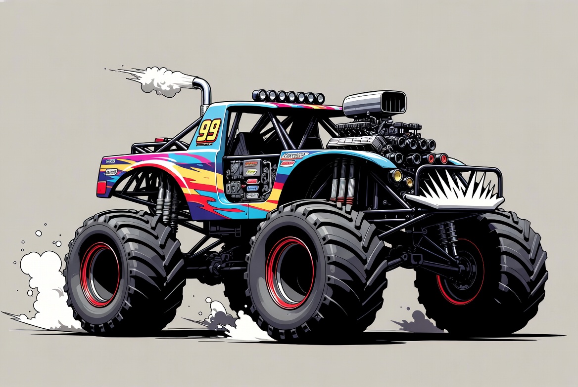 aggressive design, automotive, big tires, cartoon truck, clipart, colorful, custom truck, digital illustration, exhaust smoke, extreme vehicle, graphic art, high suspension, illustration, isolated background, mud tires, multicolor body, number 99, off-road vehicle, racing truck, roll cage, shark grille, smoke effects, supercharger, vector art, vibrant colors, monster truck