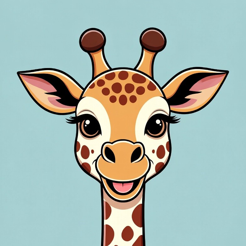 A vibrant cartoon giraffe with large expressive eyes, long eyelashes, and a big smile faces forward. It features brown spots on a light yellow body, small brown horns, and pink inner ears. The illustration is set against a solid light blue background.