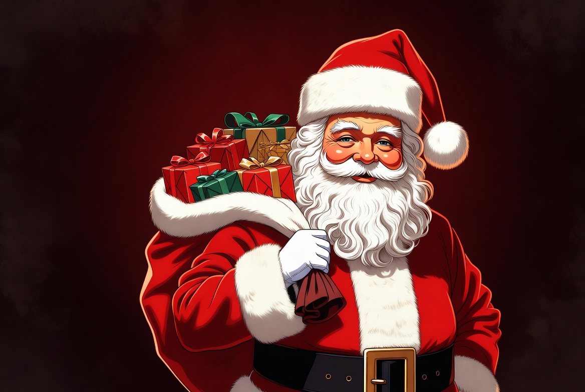 An illustration of Santa Claus with a white beard and red hat smiles broadly while carrying a large sack overflowing with colorful wrapped gifts. He wears a classic red suit with white fur trim, black belt, and white gloves. The image features a dark red background, highlighting the festive figure.