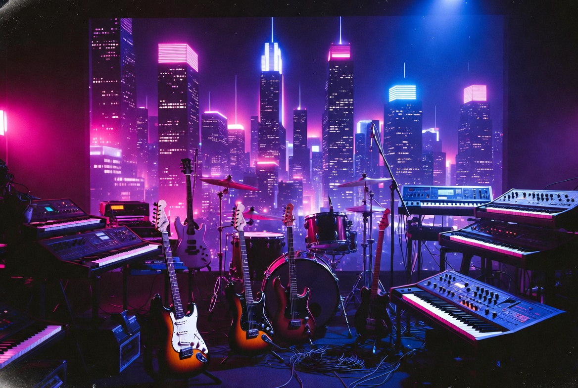 Fender Stratocaster, Les Paul guitar, band equipment, blue neon, cityscape, concert, drum kit, drum set, electric guitars, electronic keyboards, empty stage, futuristic city, instruments, keyboards, music gear, neon lights, pink neon, purple lights, retrowave, rock band, skyscrapers, stage setup, synthesizers, synthwave, vaporwave aesthetic, cyberpunk