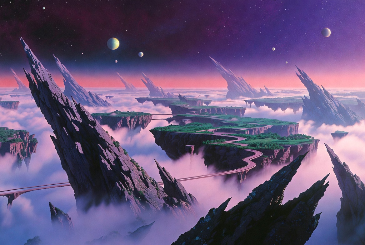 aerial view, clouds, digital art, fantasy world, green grass, illustration, jagged rocks, lush greenery, moons, pink bridge, planets, purple sky, rocky formations, sci-fi art, surreal landscape, vibrant colors, floating islands