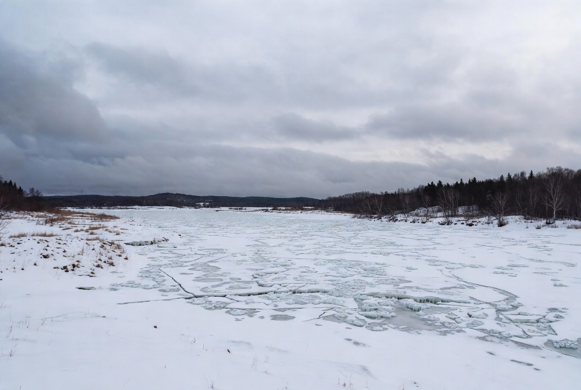 boreal forest, clouds, cold, evergreen trees, forest, frozen water, gray sky, hills, ice, icy surface, landscape, nature, overcast sky, reeds, snow, snowy shore, trees, wilderness, winter, frozen lake