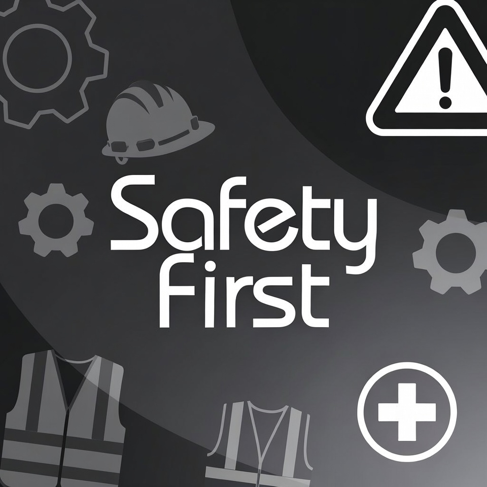 black background, caution sign, clipart, cogwheels, construction safety, first aid, gears, hard hat, hi-vis vest, illustration, industrial icons, isolated background, medical cross, reflective vest, safety graphic, safety helmet, safety symbols, warning triangle, white text, workplace safety, safety first