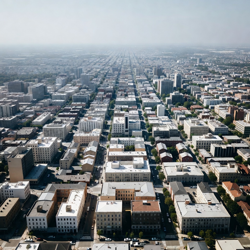 apartments, architecture, cars, city blocks, city buildings, cityscape, commercial buildings, downtown, drone photo, gray buildings, grid pattern, hazy sky, high rise, metropolis, modern city, overhead view, perspective, residential buildings, roads, rooftops, skyline, streets, urban grid, urban landscape, vast city, white buildings, aerial view