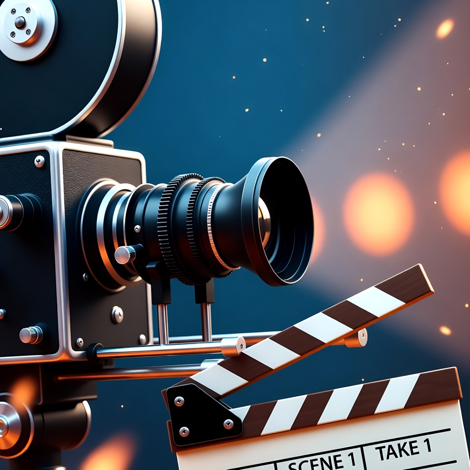 A detailed 3D rendered vintage movie camera with a large lens faces forward on a dark blue background with glowing lights. A wooden clapperboard marked 'Scene 1 Take 1' is attached to the side of the camera. Subtle bokeh effects and sparkles enhance the cinematic atmosphere.