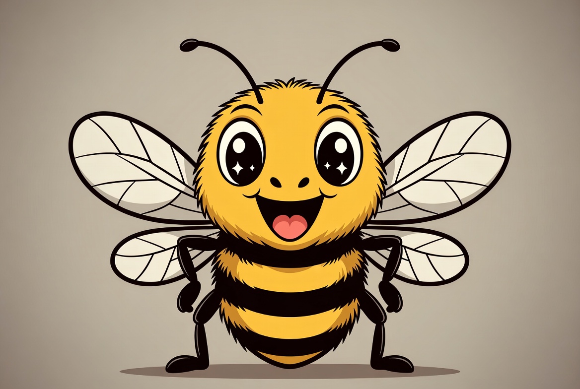 A vibrant cartoon bee with yellow and black stripes stands on a light gray background. It has large sparkling eyes, wide smile, fluffy fur, and transparent wings spread out. The bee poses happily with legs visible.