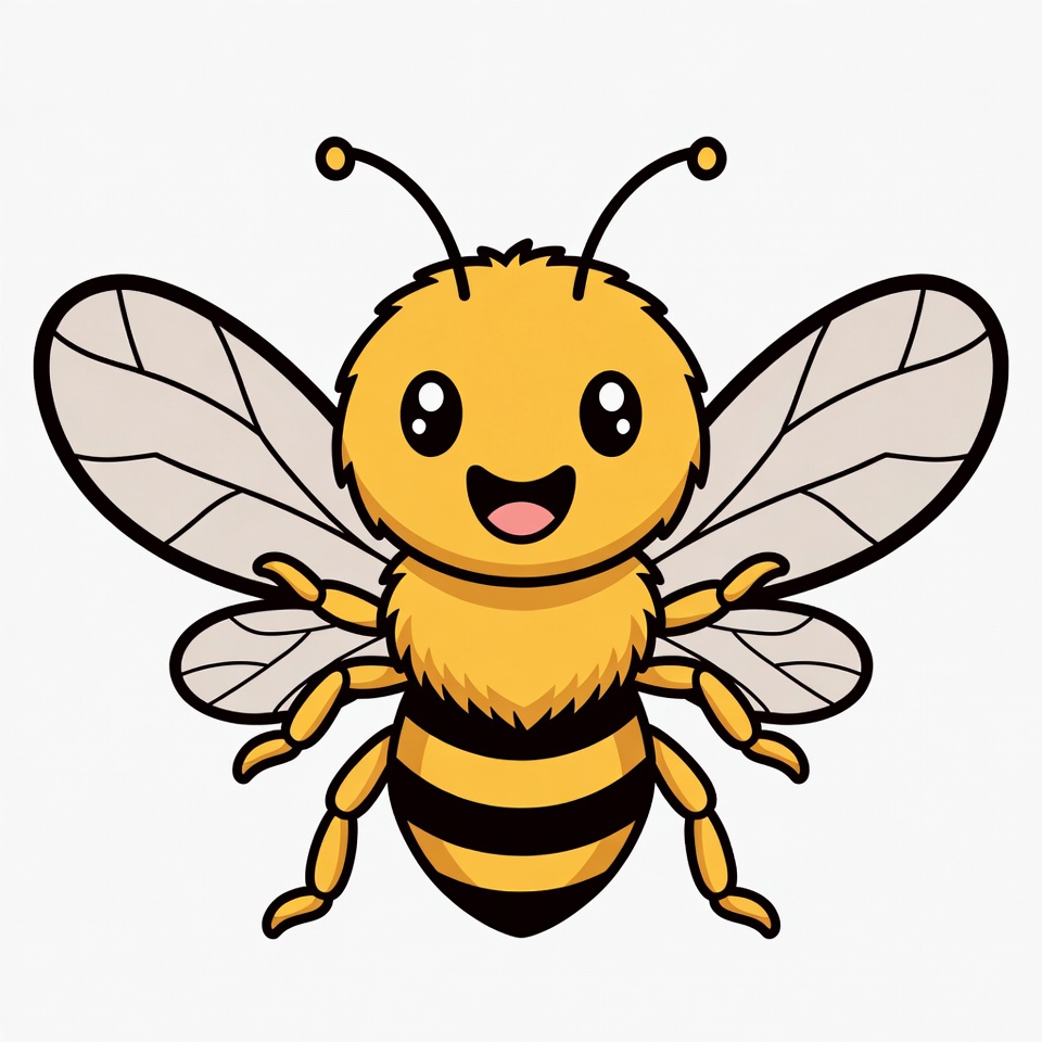 A vibrant yellow and black cartoon bee with large sparkling eyes and a wide smile faces forward. It has fluffy fur, transparent wings, and striped legs on a white isolated background. The illustration features bold outlines and a cheerful expression.