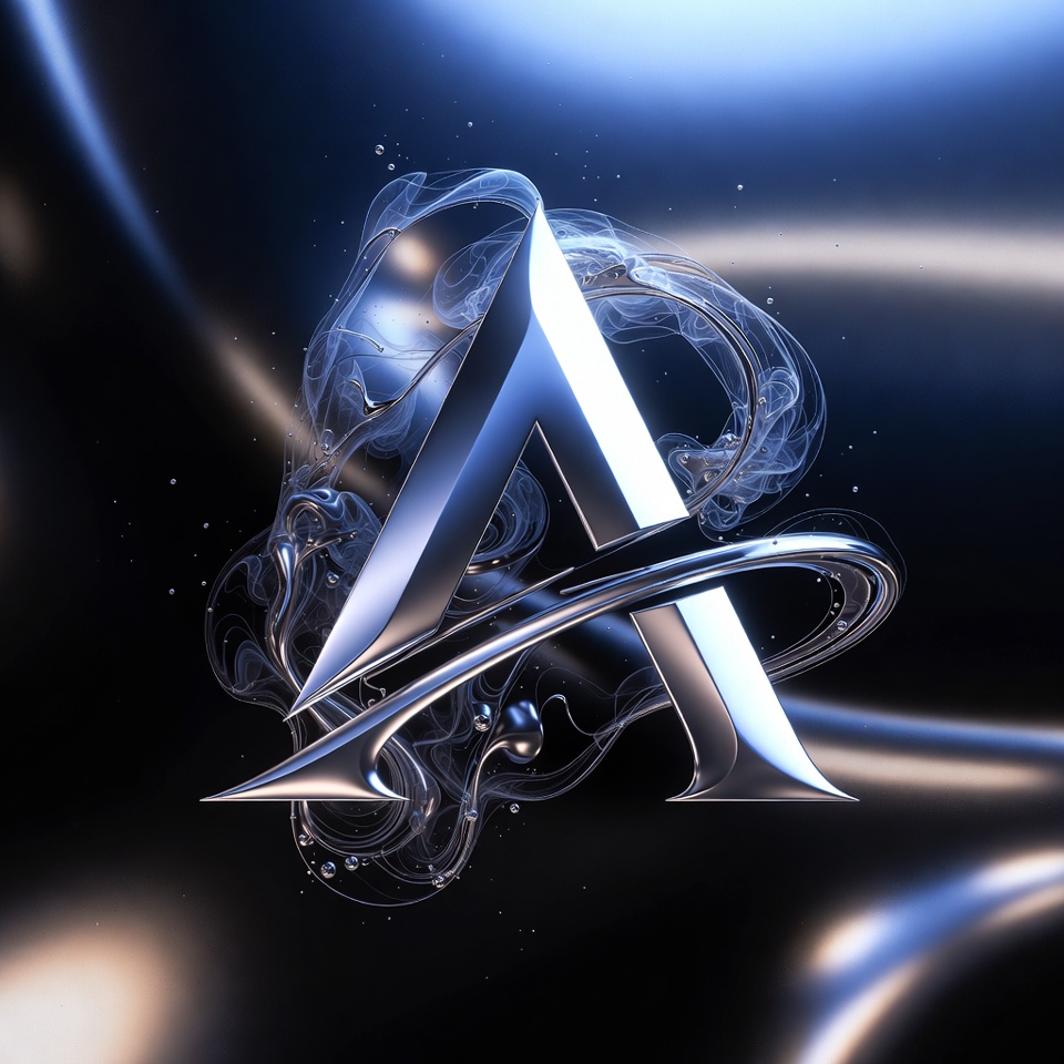 A metallic silver letter A floats in a dark blue gradient background with glowing effects. Ethereal blue wisps and fluid swirls envelop the glossy 3D typography. Subtle light reflections and bokeh particles enhance the futuristic design.