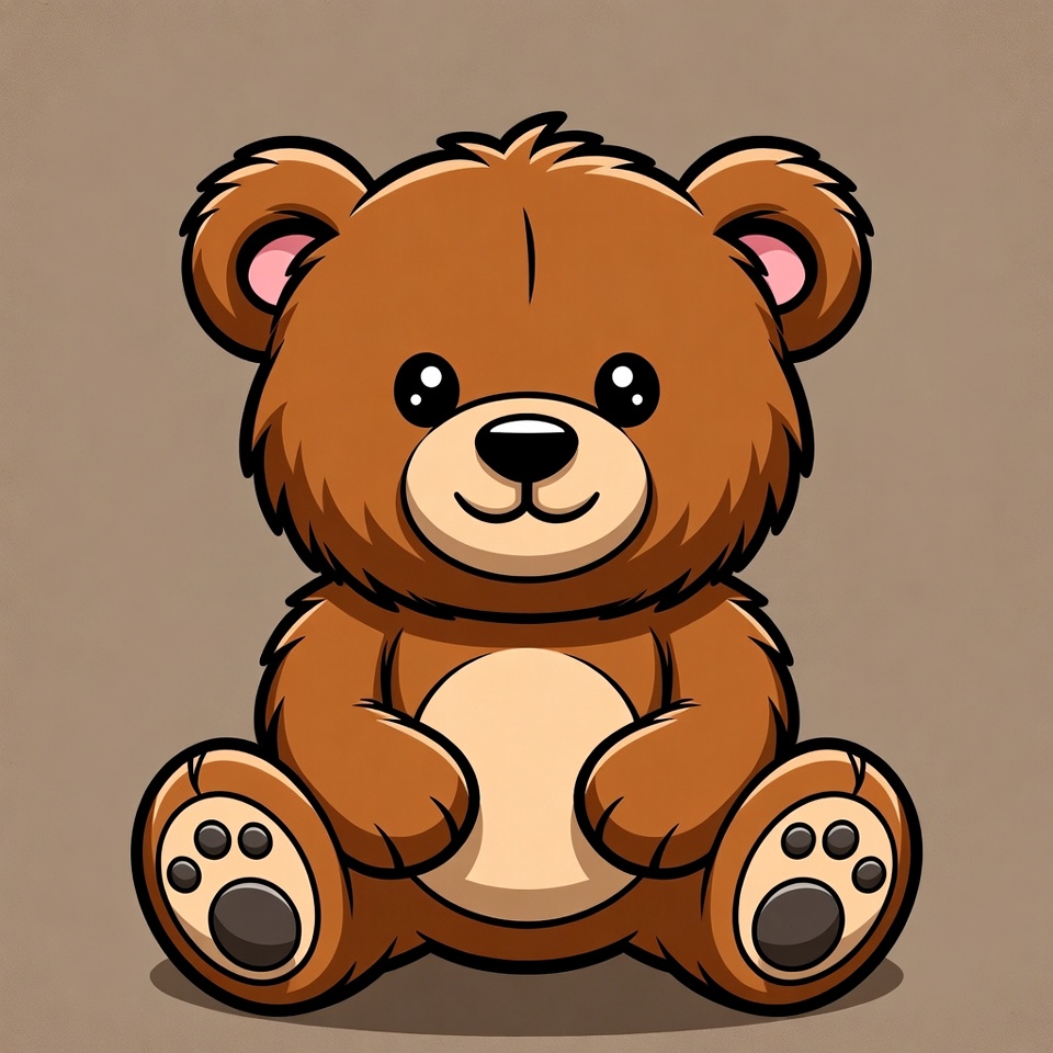 A cute brown teddy bear with big sparkling eyes sits on a beige background. The cartoon illustration features fluffy fur, a smiling mouth, and black paw pads. It has rounded ears and a cheerful expression.