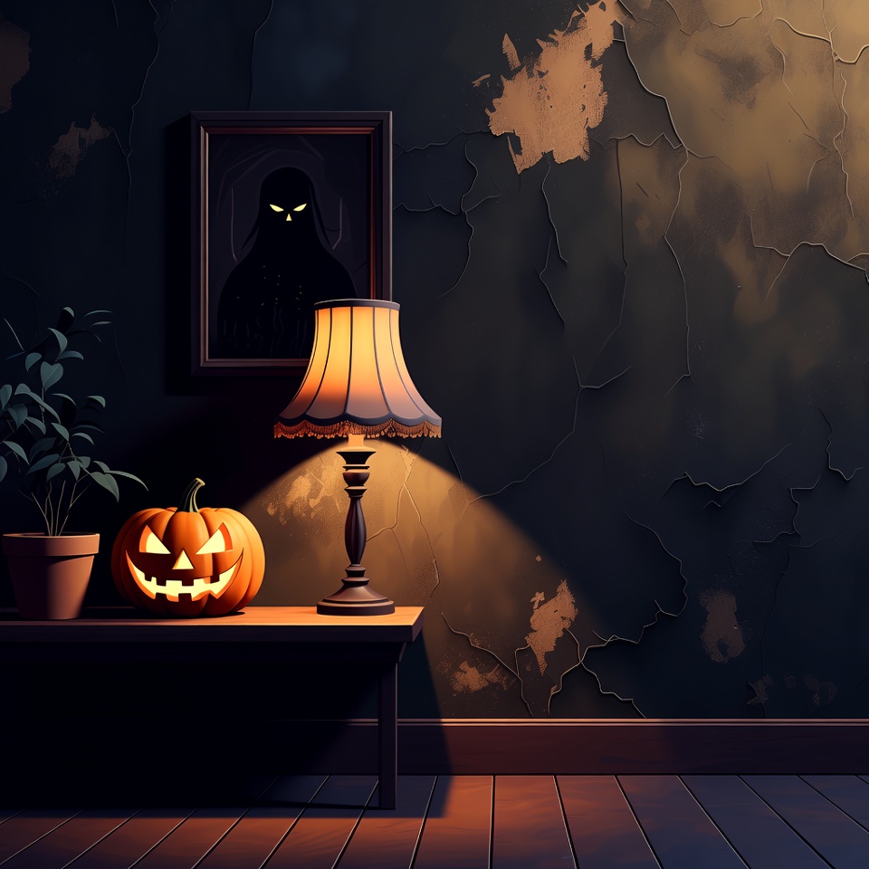 Halloween, carved face, dark room, dim light, eerie, fringed lamp, haunted house, illustration, isolated background, lamp, orange pumpkin, peeling wall, portrait, potted plant, pumpkin, shadow figure, spooky, table, wooden table, jack-o-lantern