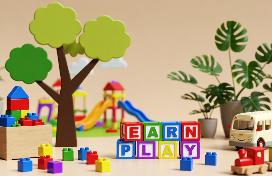 Colorful toy blocks spelling 'LEARN PLAY' sit in front of a miniature playground with slide, trees, and buildings. Scattered building blocks, toy train, van, and potted plants surround the scene on a beige background. The vibrant 3D rendered toys create an educational play setup.