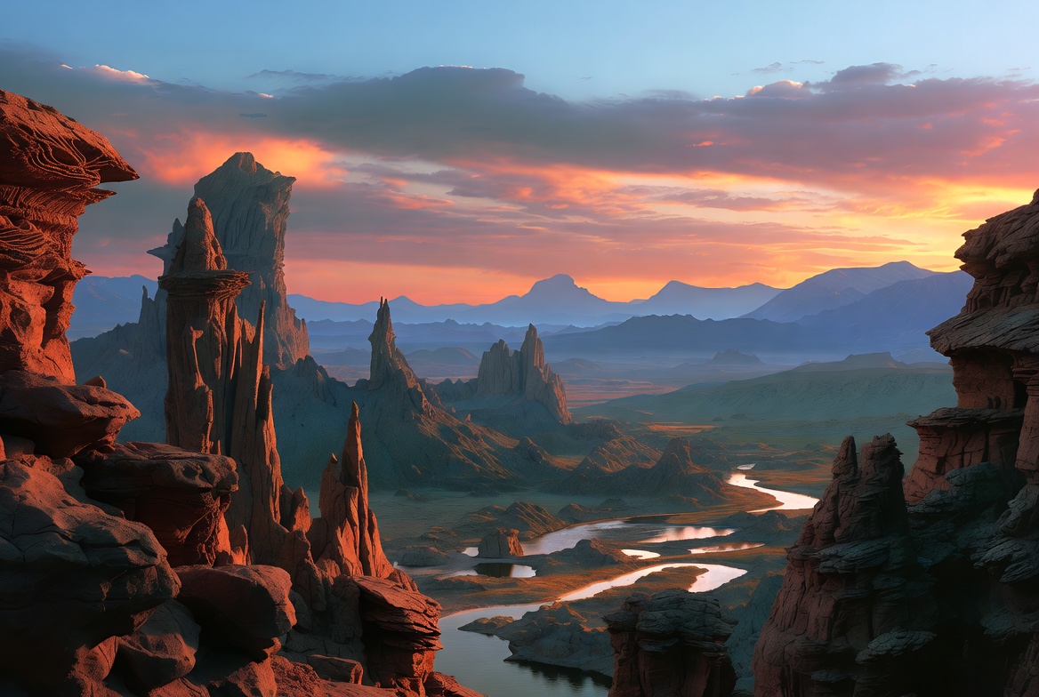 alien landscape, canyon, cliffs, digital art, distant peaks, dramatic sky, epic view, fantasy scenery, geological, horizon, illustration, landscape, mountains, nature, orange sky, purple clouds, red rocks, river, rock formations, rugged terrain, spires, twilight, valley, vibrant colors, winding river, sunset