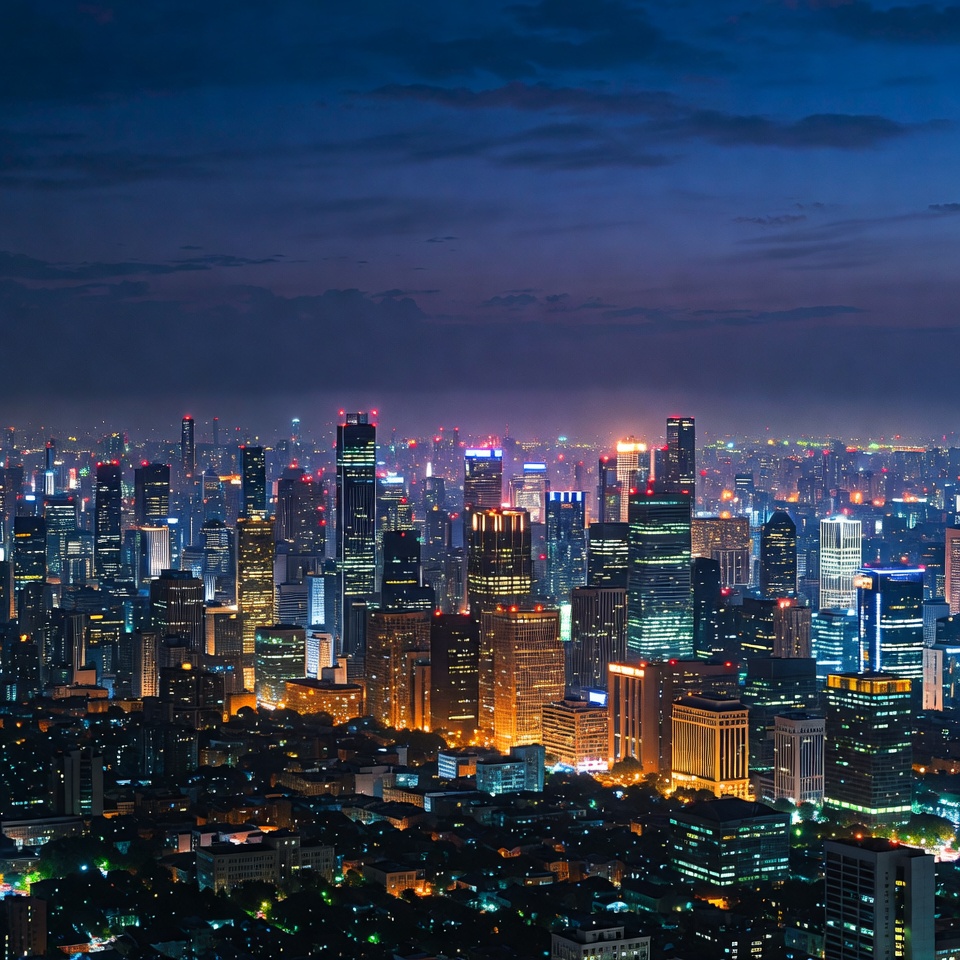 aerial view, city lights, cloudy sky, dusk skyline, glowing towers, high-rise buildings, illuminated city, metropolis, modern architecture, neon lights, night cityscape, panoramic view, skyscrapers, urban landscape, Shanghai skyline