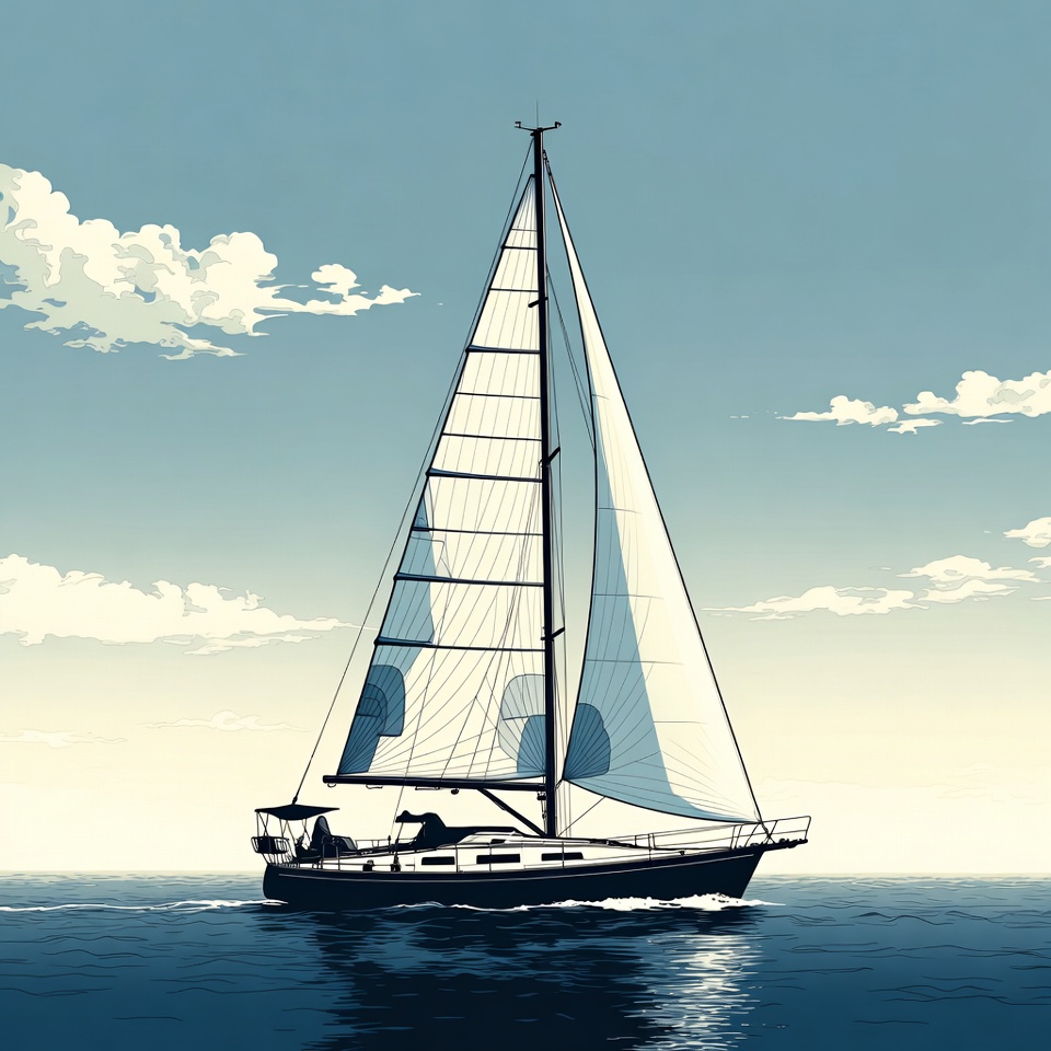 A detailed illustration of a sailboat with tall white sails gliding over calm blue ocean waters. The boat features a dark hull and cabin under a partly cloudy sky. Gentle waves reflect the vessel in the serene seascape.