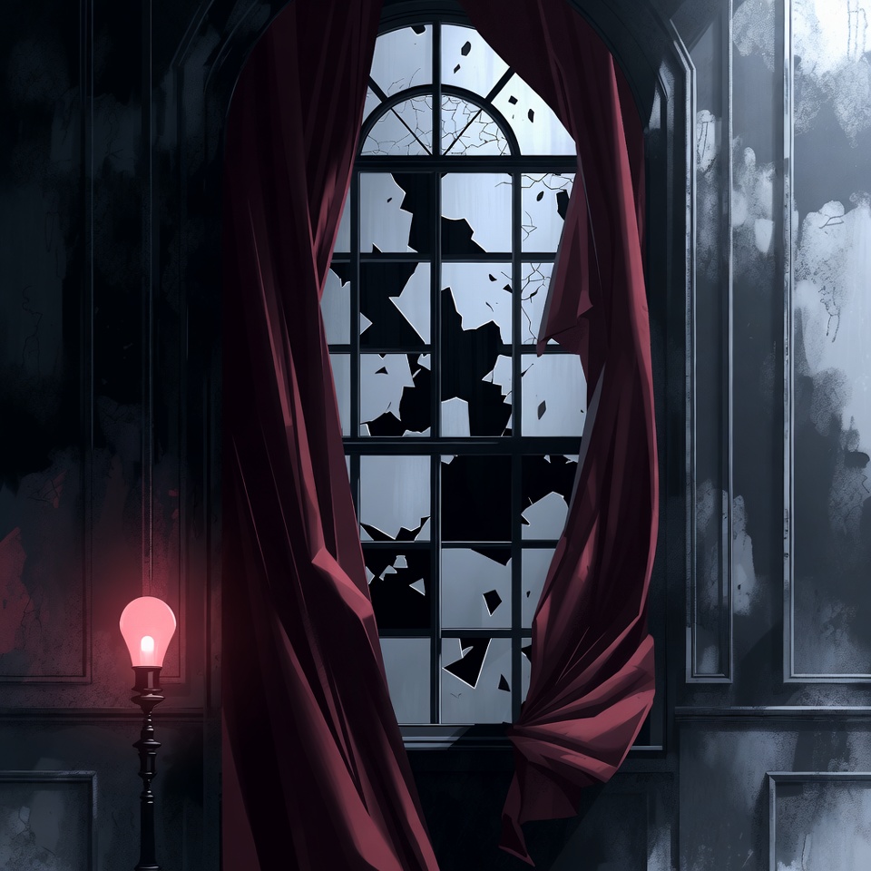 abandoned room, arched window, cracked panes, crimson drapes, curtains, dark room, digital art, dim lighting, foggy atmosphere, gothic interior, illustration, lamp glow, ornate frame, red curtains, red lamp, shattered glass, vintage lamp, window frame, window interior, broken window