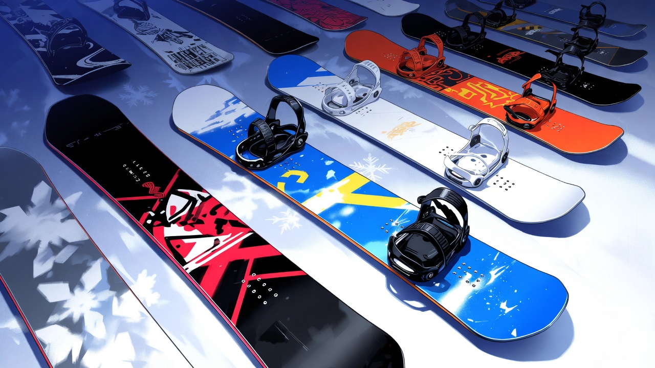 bindings, black snowboard, blue snowboard, colorful snowboards, extreme sports, isolated background, orange snowboard, pink snowboard, red snowboard, snowboard bindings, snowboarding gear, snowflakes, sports equipment, white snowboard, winter sports, snowboards