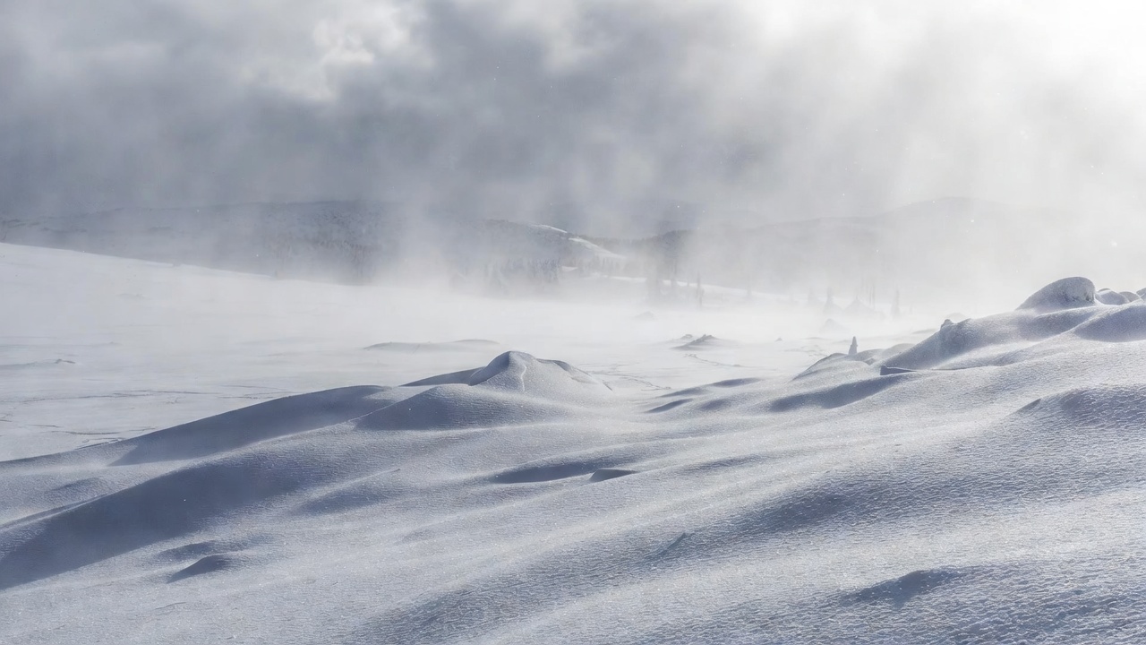 A vast snowy landscape features rolling snow drifts under a cloudy sky. Strong winds blow fine snow across the white terrain, creating a misty haze. Jagged rocks and distant mountains are faintly visible through the blizzard.