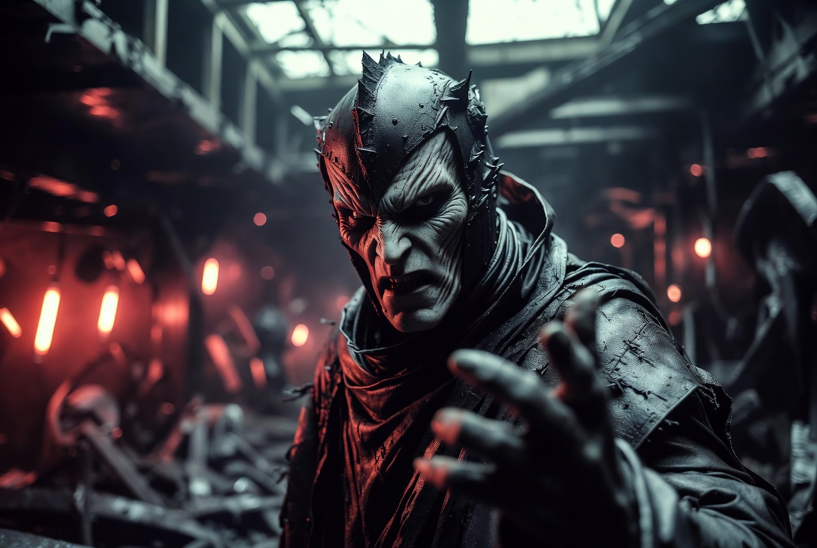 armor, black robes, broken ceiling, cyberpunk, dark background, debris, dystopian, extended hand, fantasy character, fierce glare, glowing lights, grotesque face, helmet, hood, industrial, male, menacing expression, red lights, ruins, sci-fi warrior, spiked helmet, tattered clothes, villain, white face paint, warrior