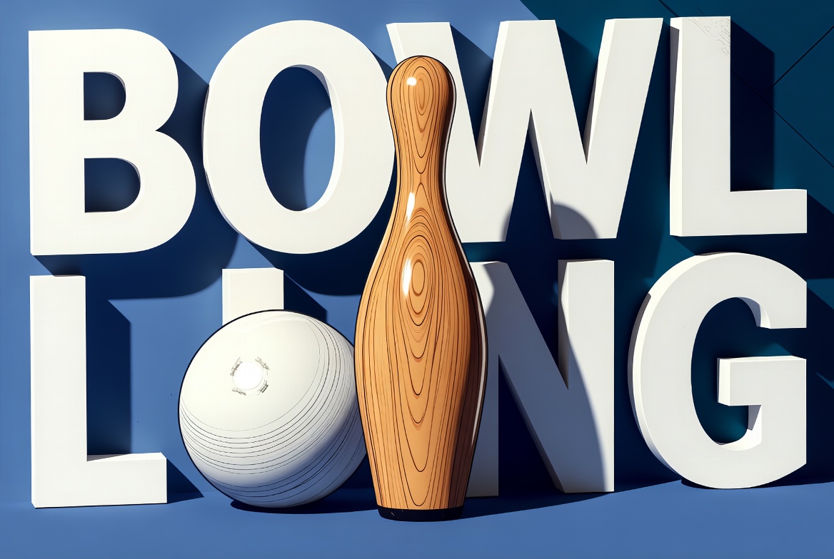 A 3D illustration features large white block letters spelling 'BOWL' on a blue gradient background. A wooden bowling pin stands prominently in front of the letters, with a white bowling ball positioned nearby. The elements are arranged to emphasize the sport of bowling.