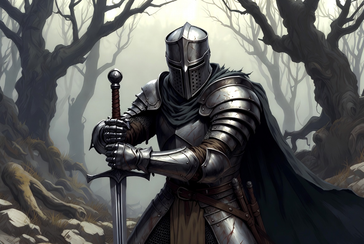 Knight Holding Sword in Dark Forest