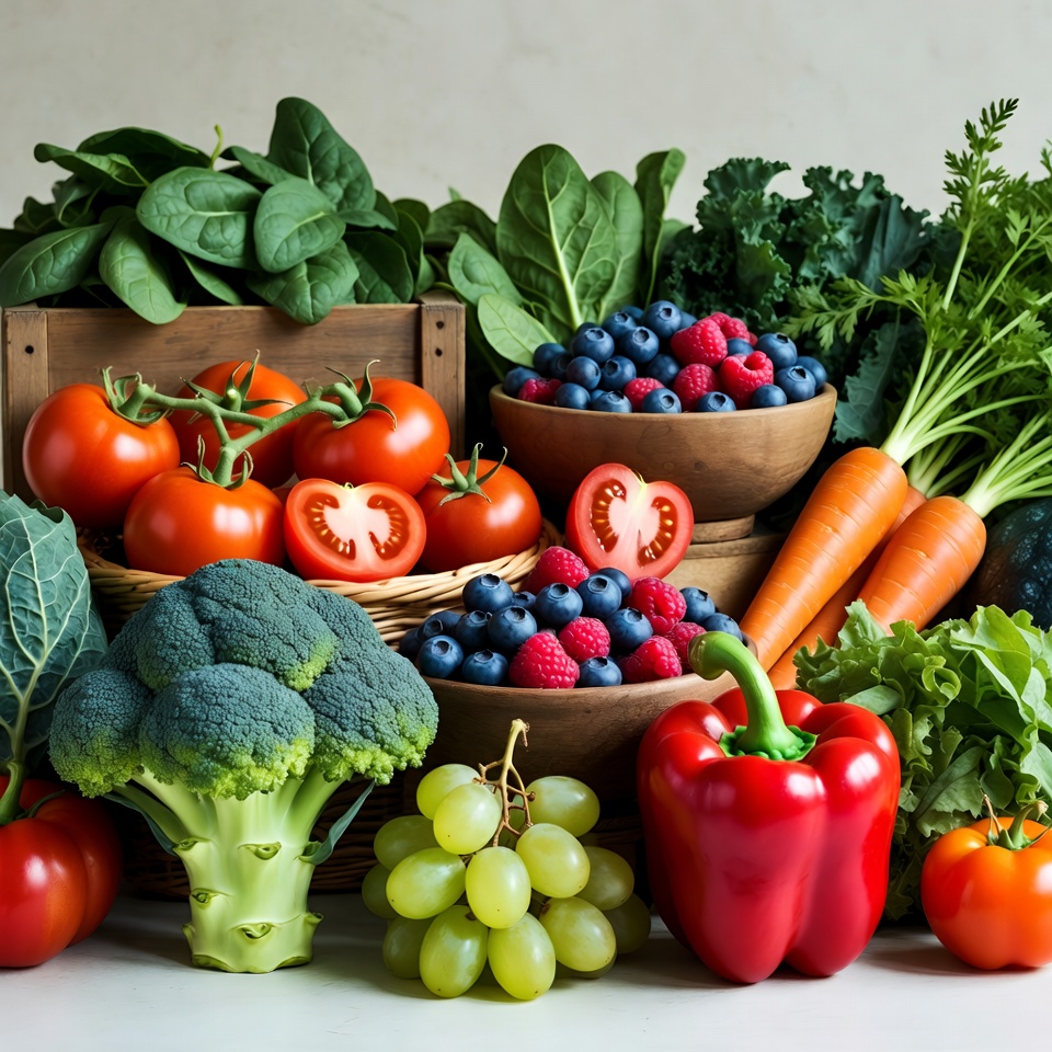 A vibrant assortment of fresh vegetables and fruits is arranged on a wooden crate against a light background. Tomatoes, broccoli, carrots, kale, spinach, red peppers, and grapes fill wooden bowls and baskets. Blueberries and raspberries add colorful berries to the healthy produce collection.