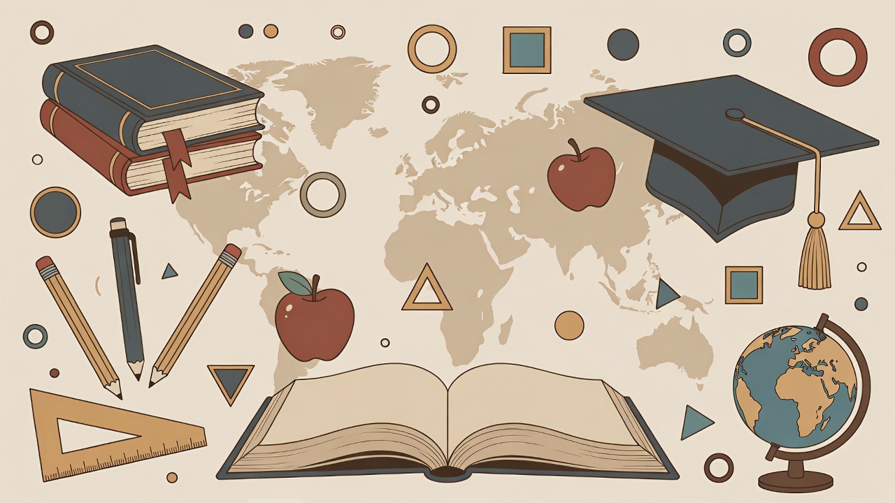 A colorful illustration features an open book at the center surrounded by stacked books, pencils, ruler, red apple, graduation cap, globe, and world map. Geometric shapes like circles, squares, and triangles in beige and brown tones decorate the beige background. Educational icons including a small desktop globe emphasize school and learning themes.