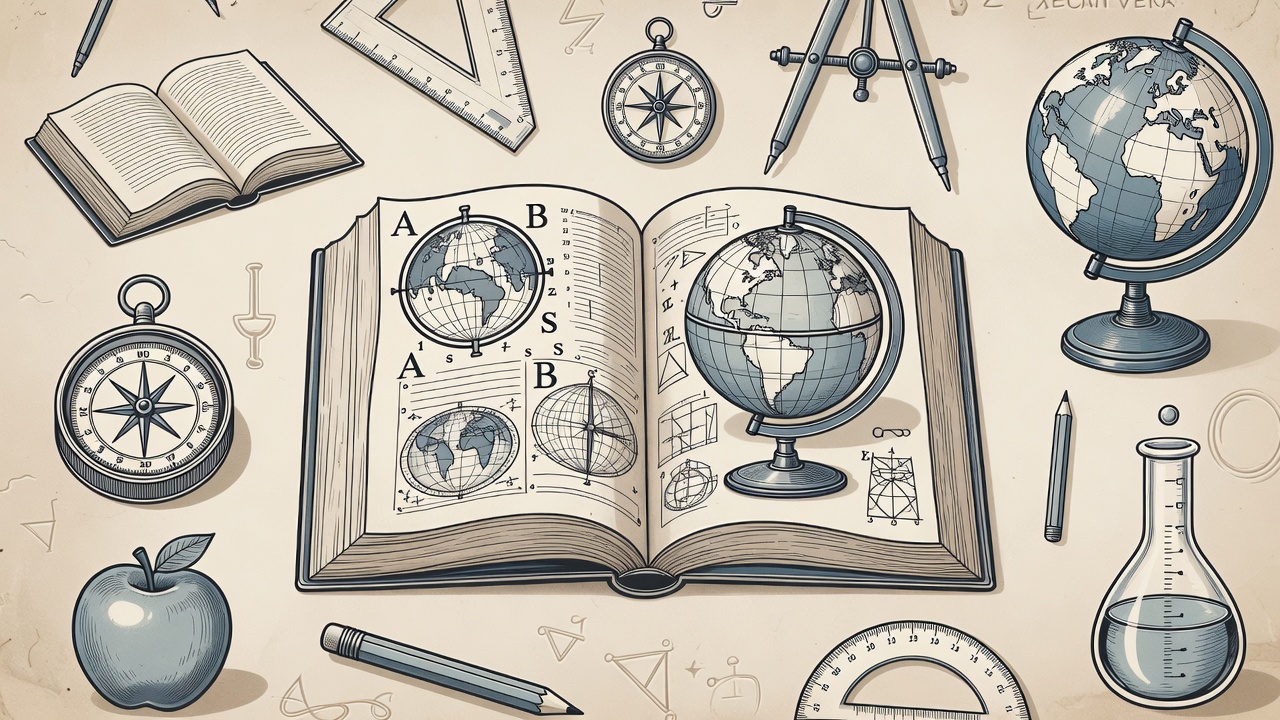 An open book displays world maps and geometric diagrams in the center of this illustration. Surrounding it are educational items including a globe, compass, ruler, protractor, pencil, apple, beaker, and open textbook. All elements are rendered in a blue-toned vector art style on a beige background.