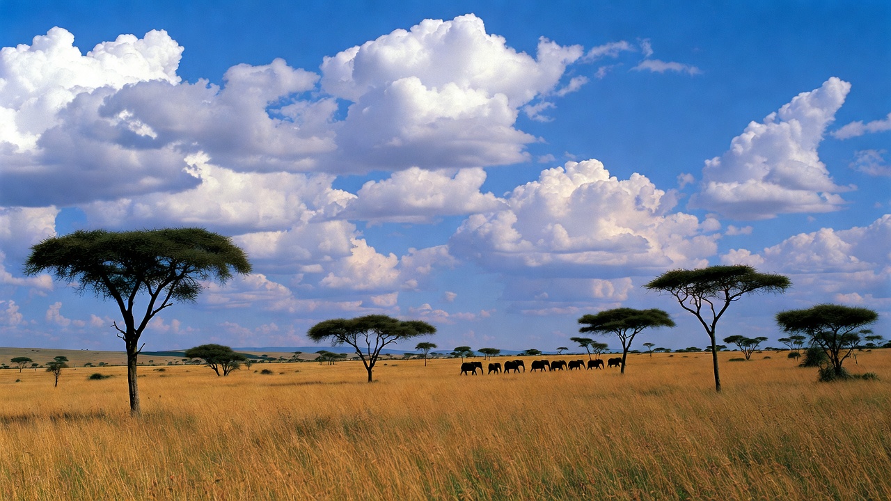 Africa, African savanna, acacia trees, animals, blue sky, elephant herd, golden grass, grassland, herd walking, nature, outdoors, plain, safari, savanna, tall trees, white clouds, wilderness, wildlife, elephants