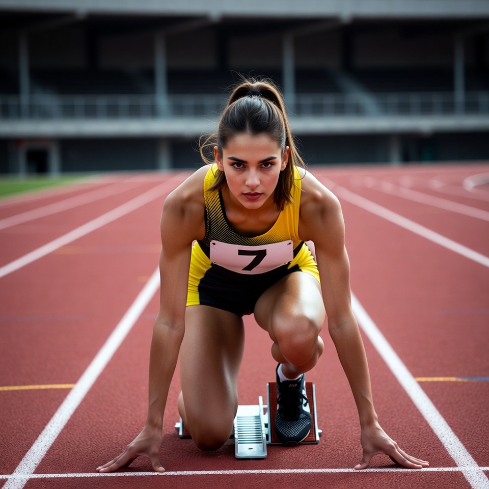 athlete, athletic wear, black shorts, competition, crouching, dark hair, empty stadium, female, fitness, number 7, outdoor, ponytail, race start, ready to run, running, running shoes, sports, sprint, stadium, starting blocks, track, track and field, yellow jersey, woman