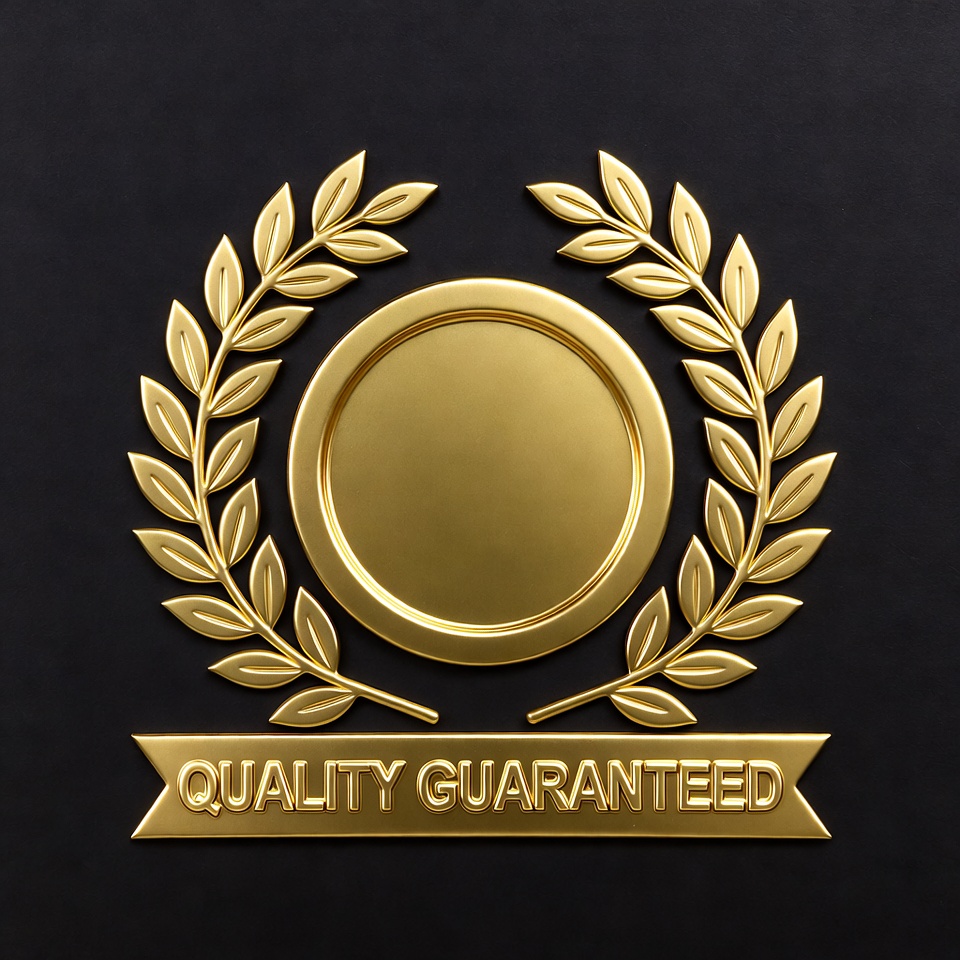 A 3D golden laurel wreath encircles a blank gold circle on a black background. Below the emblem, a gold banner reads 'QUALITY GUARANTEED' in bold letters. The design features intricate laurel leaves and a metallic shine.