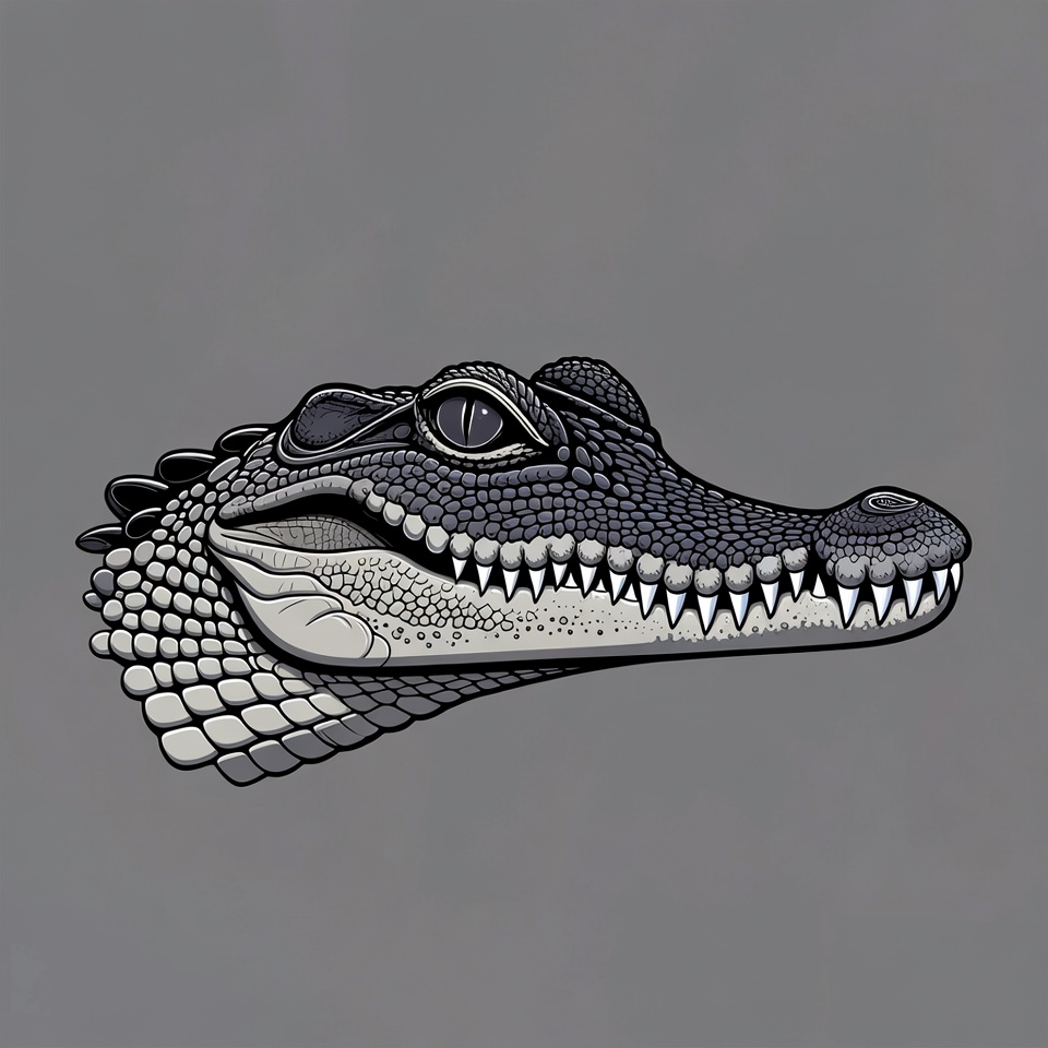 alligator similar, animal illustration, clipart, crocodile head, fierce eyes, gray crocodile, isolated background, jaws open, predator, profile view, reptile, scales, sharp teeth, wildlife art, crocodile