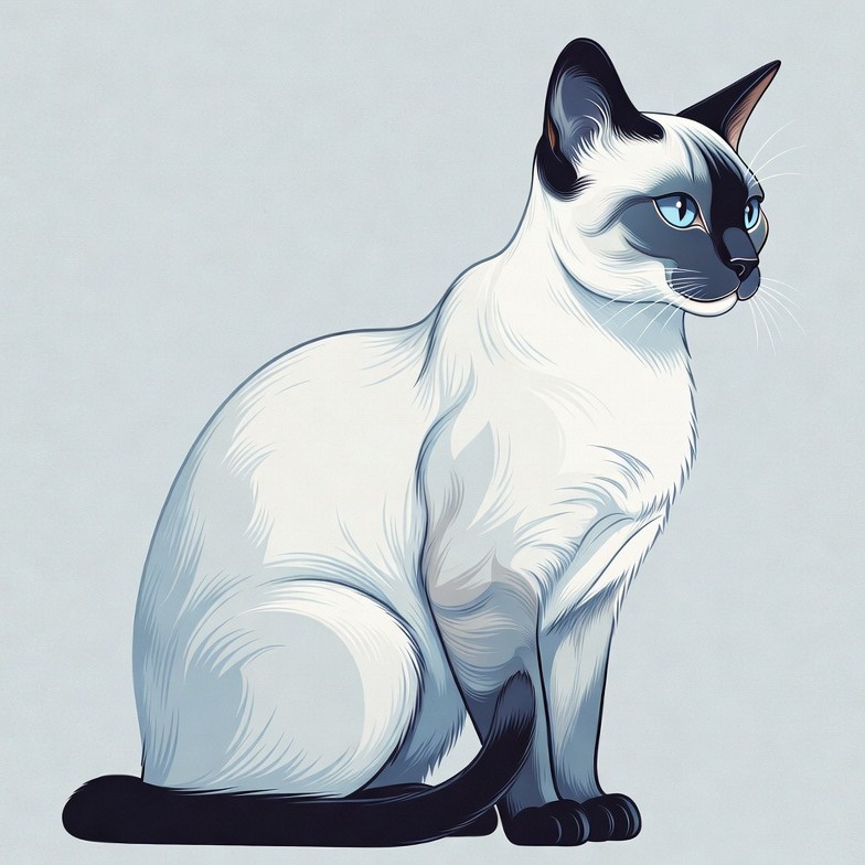 A detailed digital illustration of a Siamese cat sitting on a plain background. The cat has a white body with dark points on its ears, face, legs, and tail, and striking blue eyes. It faces slightly to the side with a sleek, fluffy fur texture.