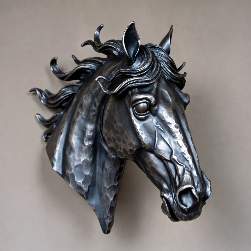 animal, artistic, bronze, decor, equine, flowing mane, horse head, isolated background, mane, metal, profile view, sculpture, textured surface, wall art, horse