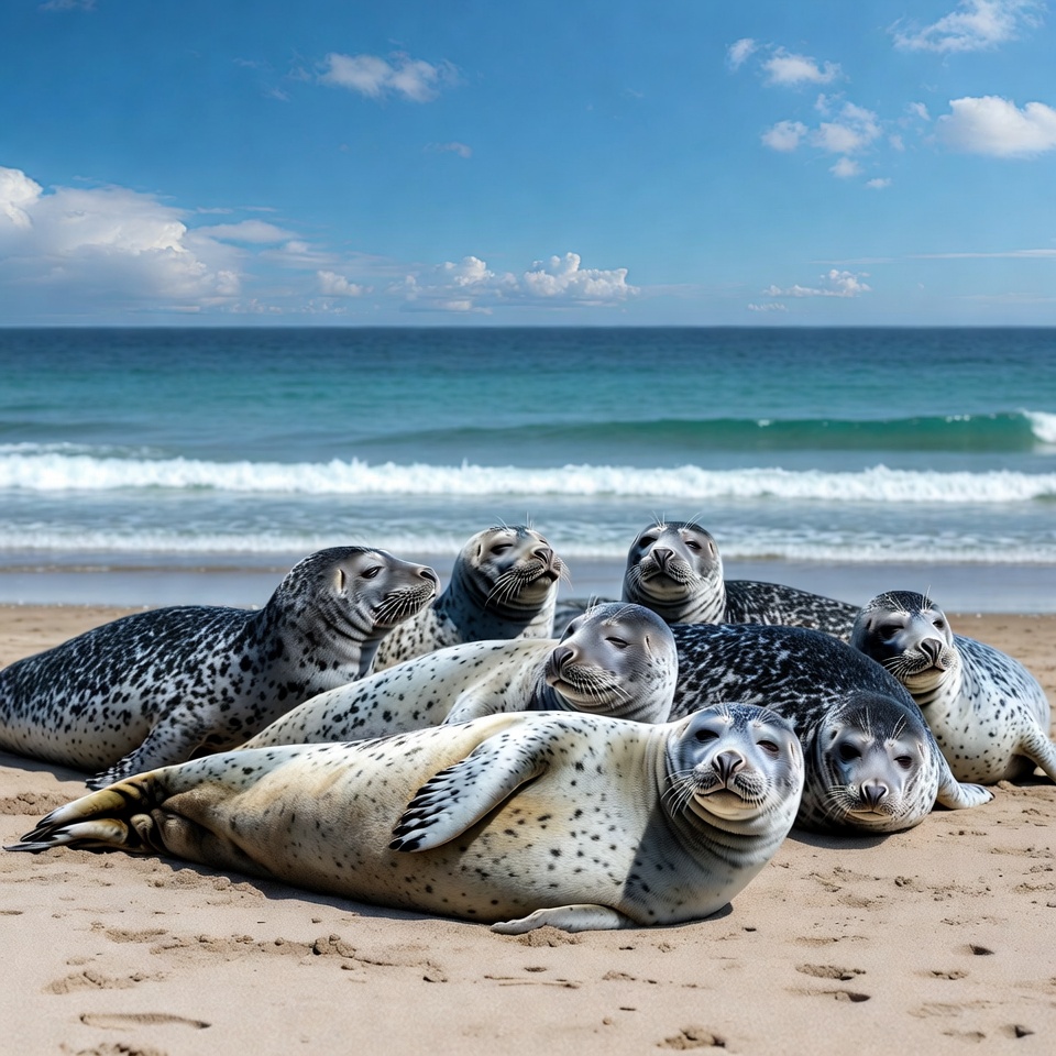 animals, beach, blue sky, clouds, coast, flippers, gray seals, group seals, marine mammals, nature, ocean, sand, sea, seal pups, seals, seals on beach, shoreline, spotted seals, sunny day, water, waves, wildlife, harbor seals