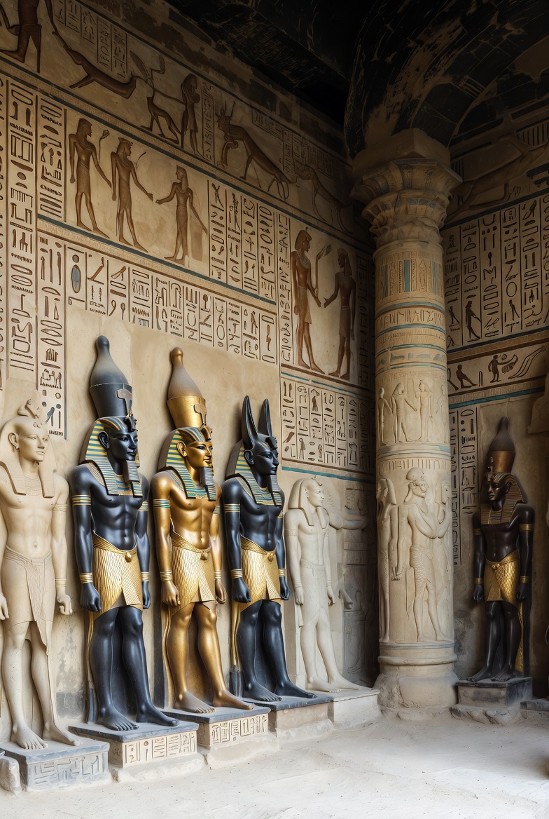 Anubis, Egyptian art, Osiris, ancient Egypt, ancient architecture, archaeological site, black statue, columns, deities, gold statue, hieroglyphs, historical, mythology, pharaoh headdress, sandstone, statues, temple interior, tomb reliefs, wall carvings, Egyptian gods