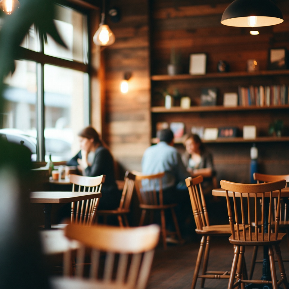 Three people sit at wooden tables in a warmly lit cafe with wooden walls and shelves lined with books and plants. A woman with brown hair rests her chin on her hand while a man and another woman engage in conversation nearby. Large windows show a blurred outdoor street view, with pendant lights and potted greenery adding to the ambiance.