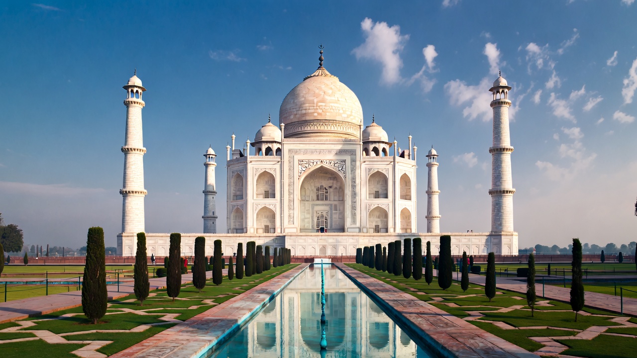 Agra, India, Mughal, UNESCO, architecture, blue sky, cypress trees, dome, gardens, historical site, landmark, lawn, mausoleum, minarets, reflecting pool, symmetry, tourism, travel, water reflection, white marble, Taj Mahal