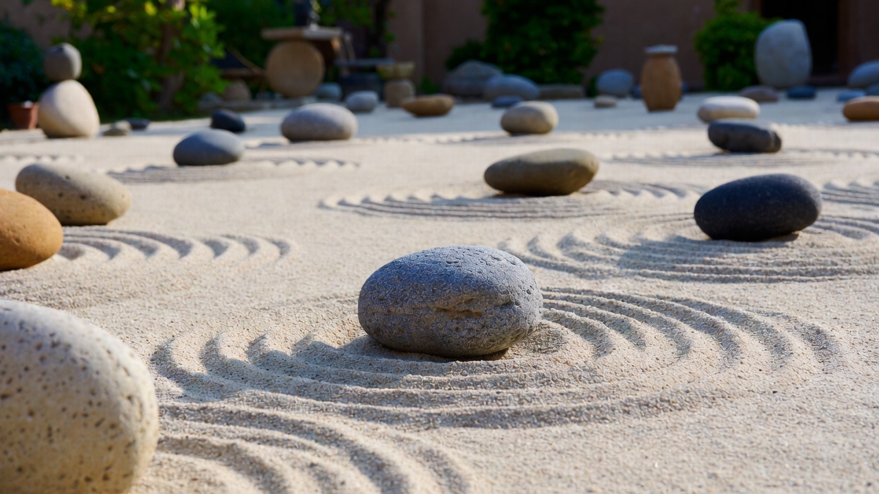 A serene Zen garden features smooth rocks of various sizes and colors arranged on raked sand with intricate swirling patterns. Larger stones and plants are visible in the background, enhancing the tranquil landscape. The sand ripples create symmetrical designs around the central rocks.
