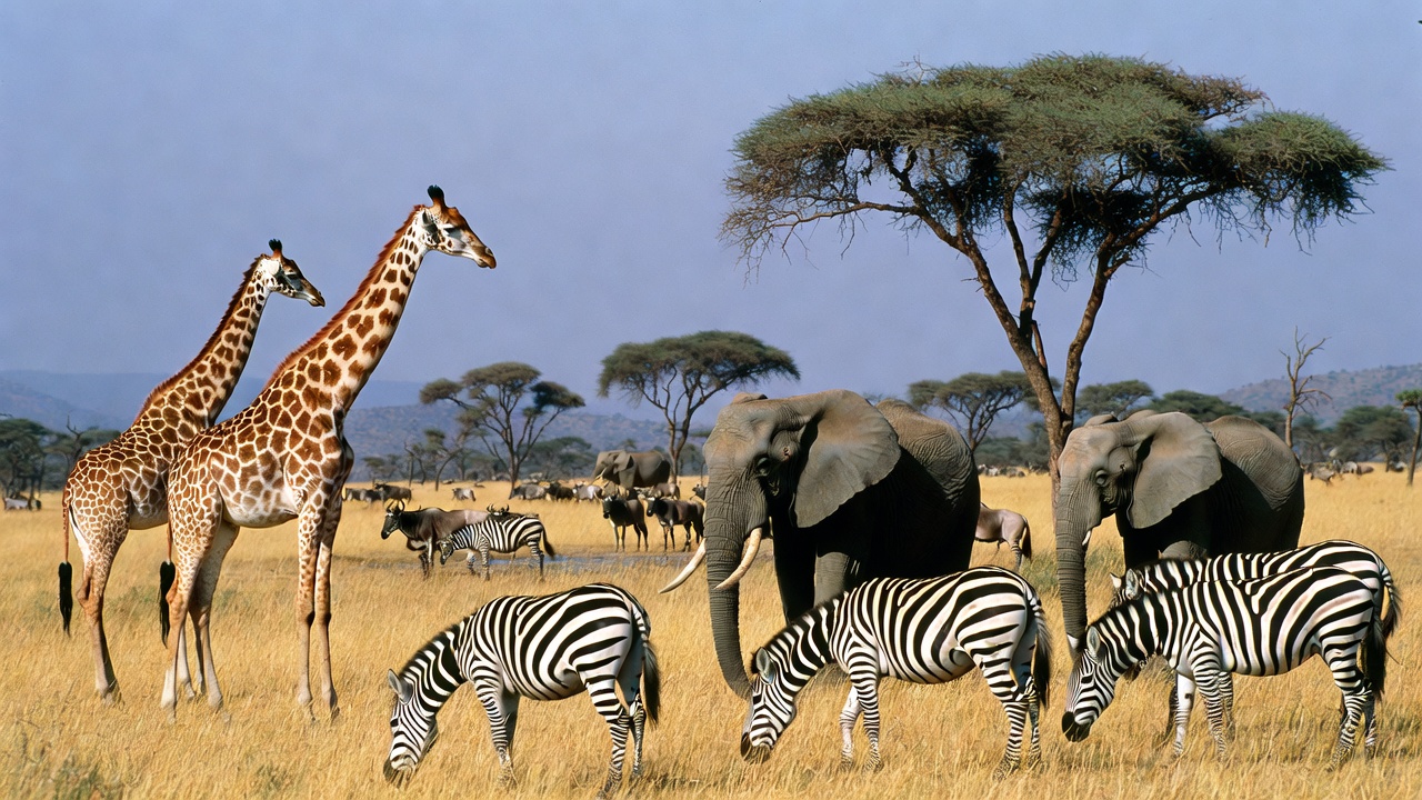 African wildlife, acacia tree, animals, blue sky, elephant herd, elephants, grassland, grazing animals, herd, mountains, nature, plains, safari, savanna, tall giraffes, wildlife, zebra stripes, zebras, giraffes