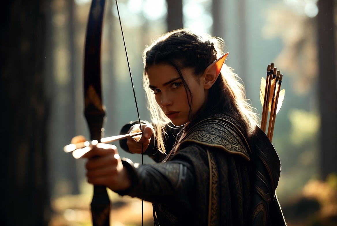 White, aiming arrow, archer, arrows, bow and arrow, brown hair, drawing bow, elf, fantasy, fantasy character, female, forest background, leather armor, long hair, misty woods, ornate armor, pointed ears, quiver, sunlight, trees, warrior elf, woman, elf woman