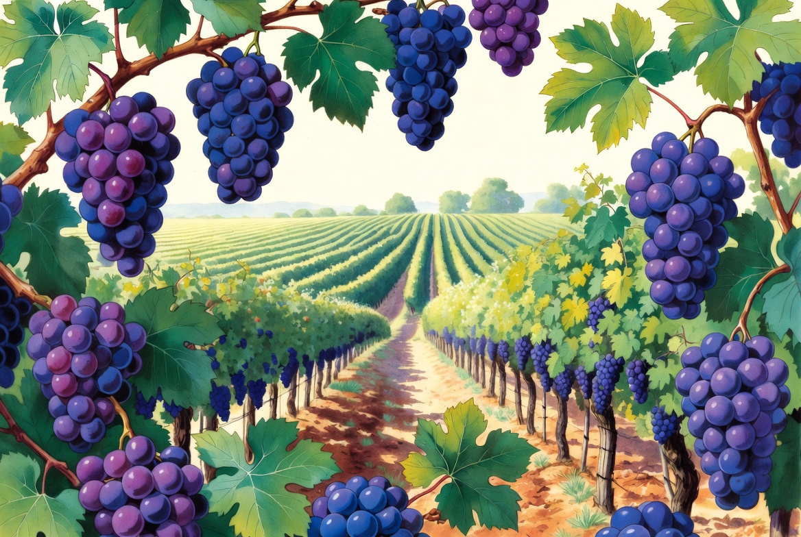 A vibrant illustration depicts rows of grapevines stretching across a sunny field with a dirt path in the center. Lush green leaves and clusters of ripe purple grapes frame the foreground. Distant trees and hills complete the scenic vineyard landscape.
