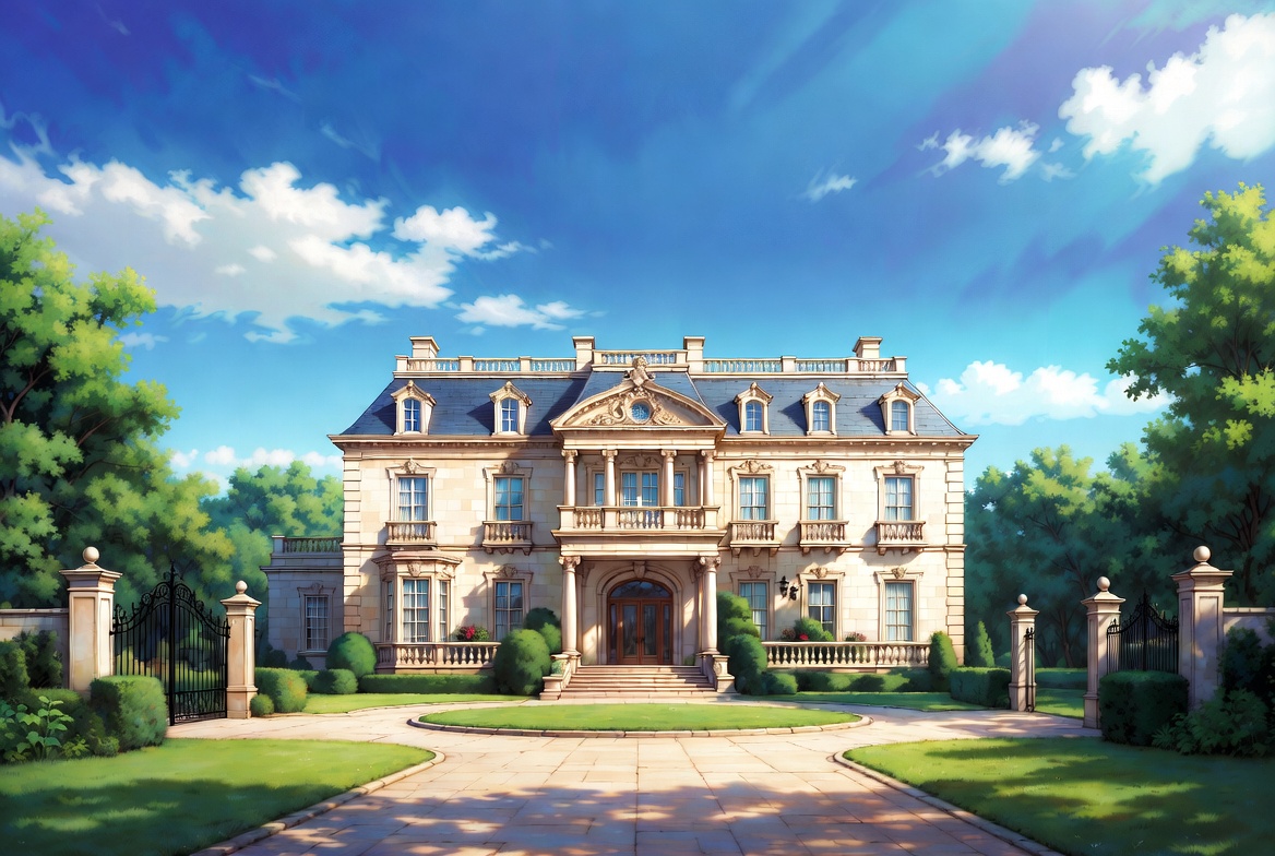 French chateau, anime style, architecture, beige building, blue roof, blue sky, circular driveway, clouds, driveway, estate, front view, grand house, green lawn, hedges, illustration, landscape, luxurious mansion, luxury home, manicured garden, ornate facade, residential estate, stone gates, sunny day, trees, mansion