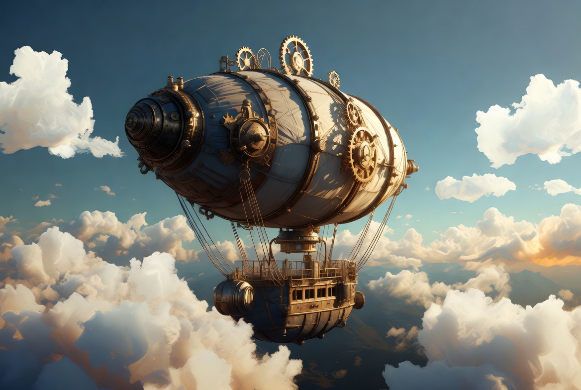 A detailed steampunk airship with brass gears, pipes, and mechanical details floats through fluffy white clouds. The elongated balloon and gondola feature intricate metallic designs against a sunset sky. It drifts gracefully in a fantastical aerial scene.