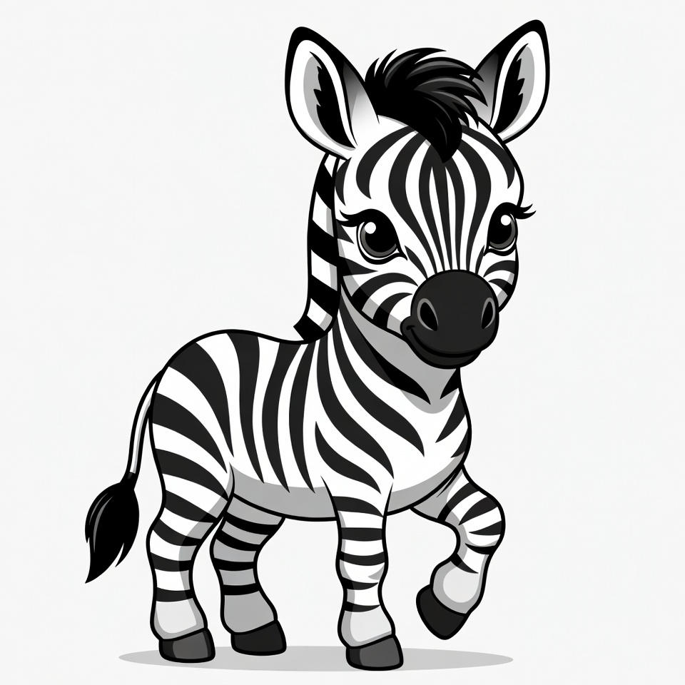 A cute cartoon baby zebra stands on a white background with black and white stripes. It has large expressive eyes, a fluffy mane, and a playful pose with one front leg raised. The illustration features bold outlines and a friendly expression.